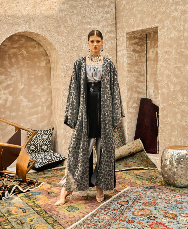 •Gold leather trim on bisht edges