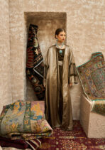 The inner layer is crafted from deep velvet, offering softness and warmth. Over it sits a flowing bisht made from a refined blend of light leather and velvet panels, creating a modern contrast in texture and movement.