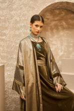 الأكمام مزينة بترتر برونزي ناعم يضيف لمعة رقيقة، ويأتي التصميم مع حزام جلدي نحيف لإبراز الخصر بشكل أنثوي وراقي.