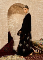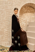 أما البشت الخارجي فهو من المخمل الفاخر، مزدان بـ شك وخرز سيلفر ممزوج بألوان متناغمة تضيف لمسة فخمة وراقية. تأتي الأكمام مع هدب بلون بدني يكمل جمال التصميم ويعطيه طابعاً كلاسيكياً مع لمسة مودرن.