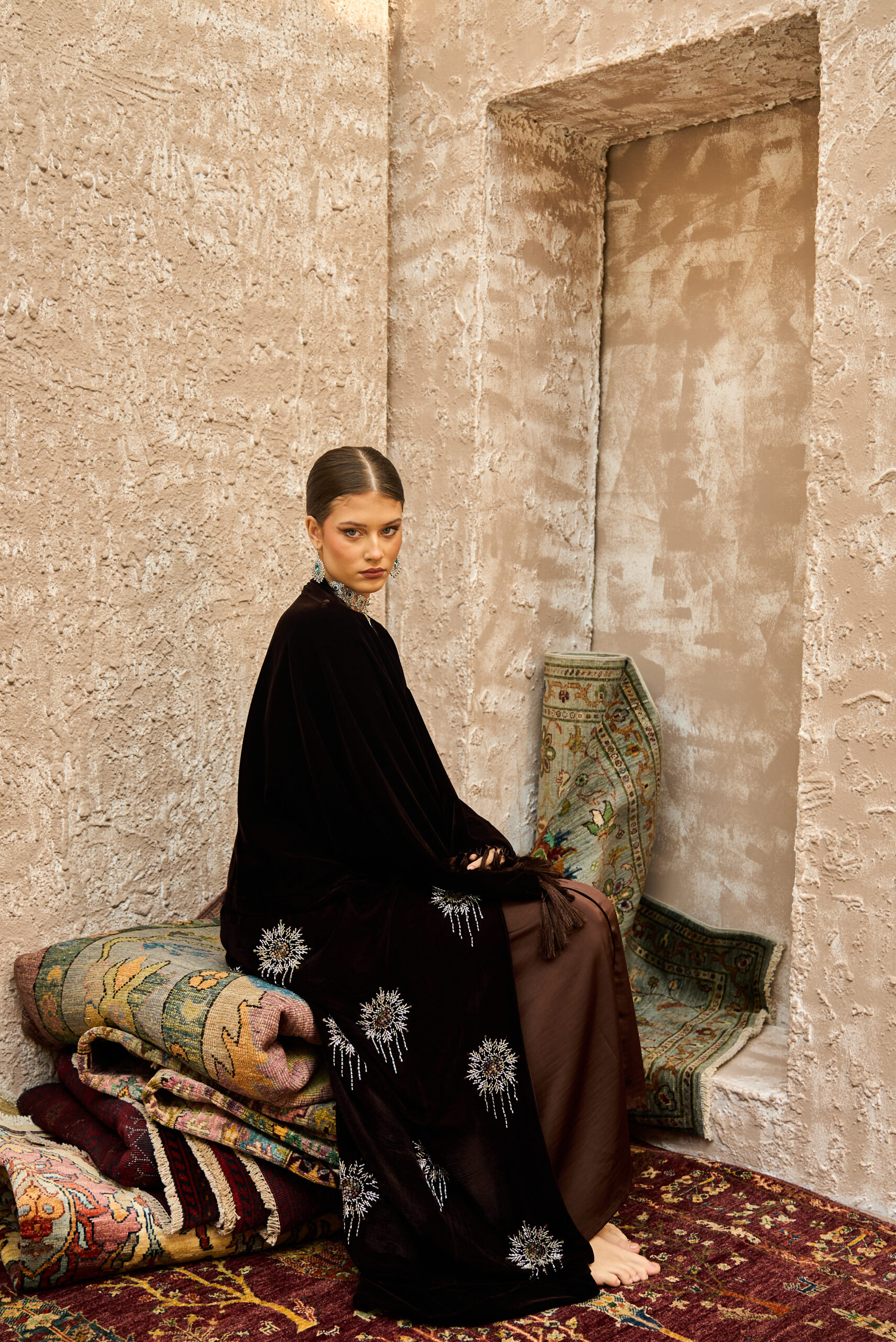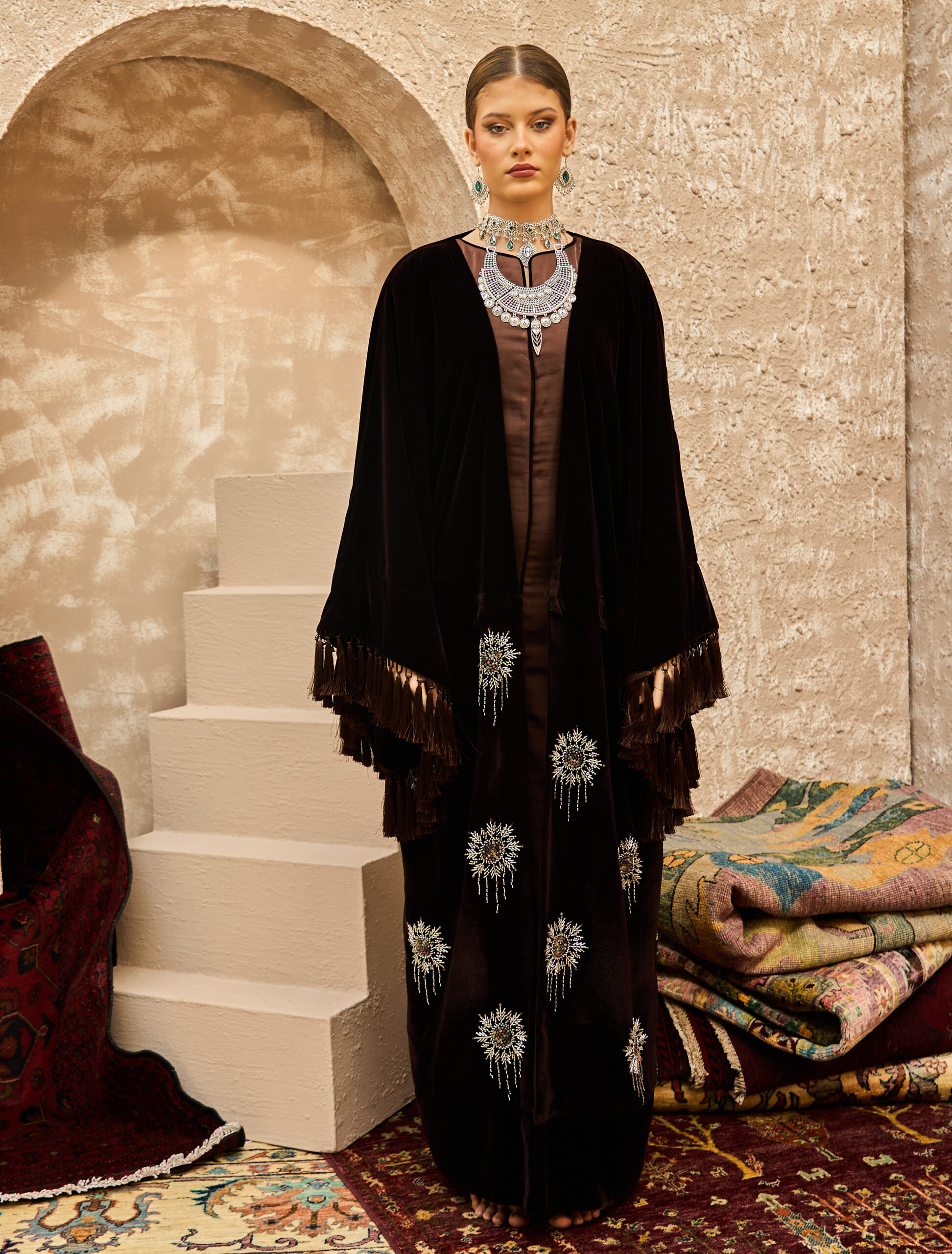 The outer layer is a luxurious velvet bisht, embellished with silver beading blended with harmonious tones for a refined, elevated finish. The sleeves are accented with beige fringe, adding a classic yet modern touch.