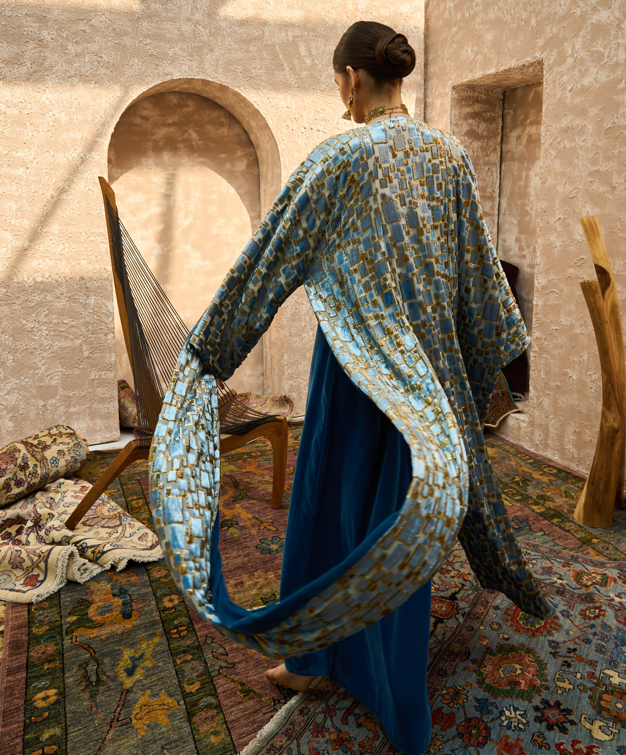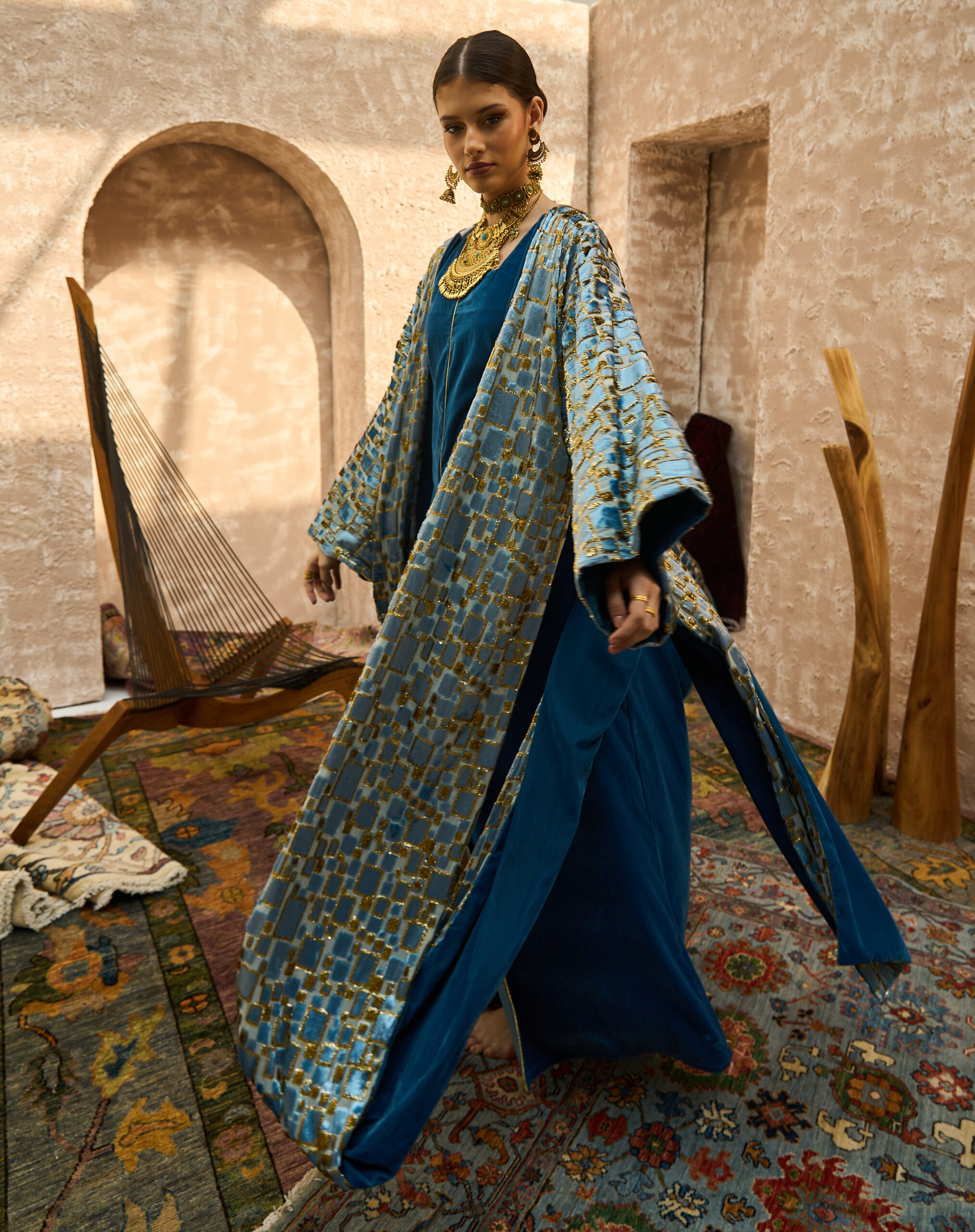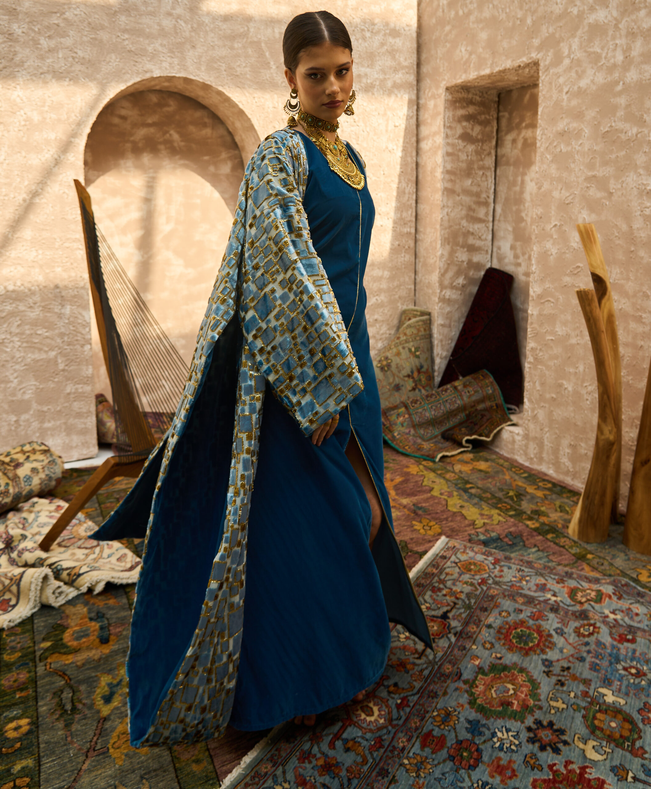 • Chiffon bisht with dual-tone velvet: gold & deep blue