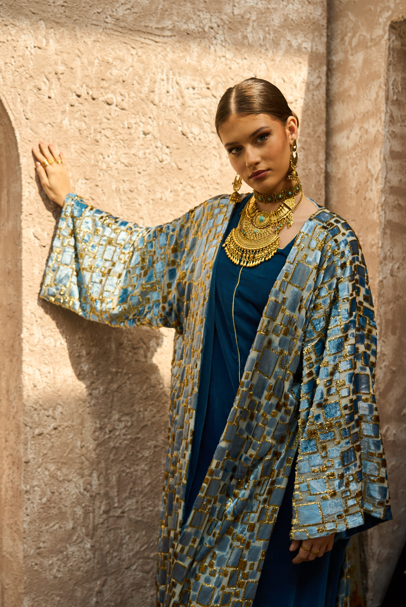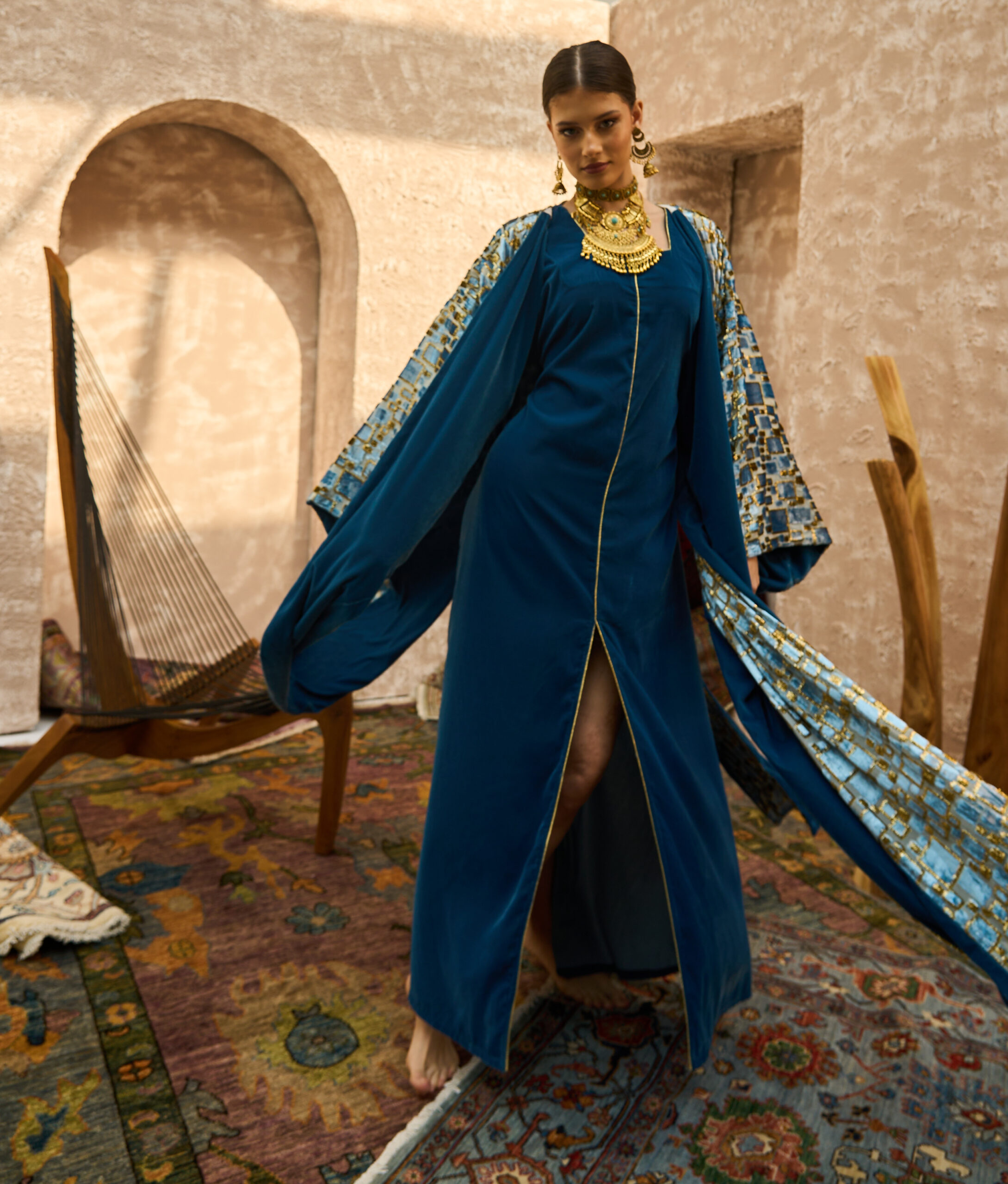البشت مصنوع من شيفون خفيف مطعّم بـ مخمل بدرجتين: الذهبي والأزرق بنقشة هندية ناعمة تمنح لمعاناً وأناقة مميزة مع الحركة.