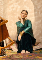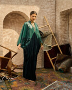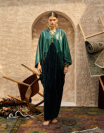 كفتان قطعة واحدة بلون زمردي غني يجمع بين ثلاث خامات فاخرة في تصميم واحد مميّز.