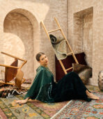The design merges shimmering sequins, soft leather, and crinkled velvet in a clean geometric layout that highlights the depth and beauty of the color.