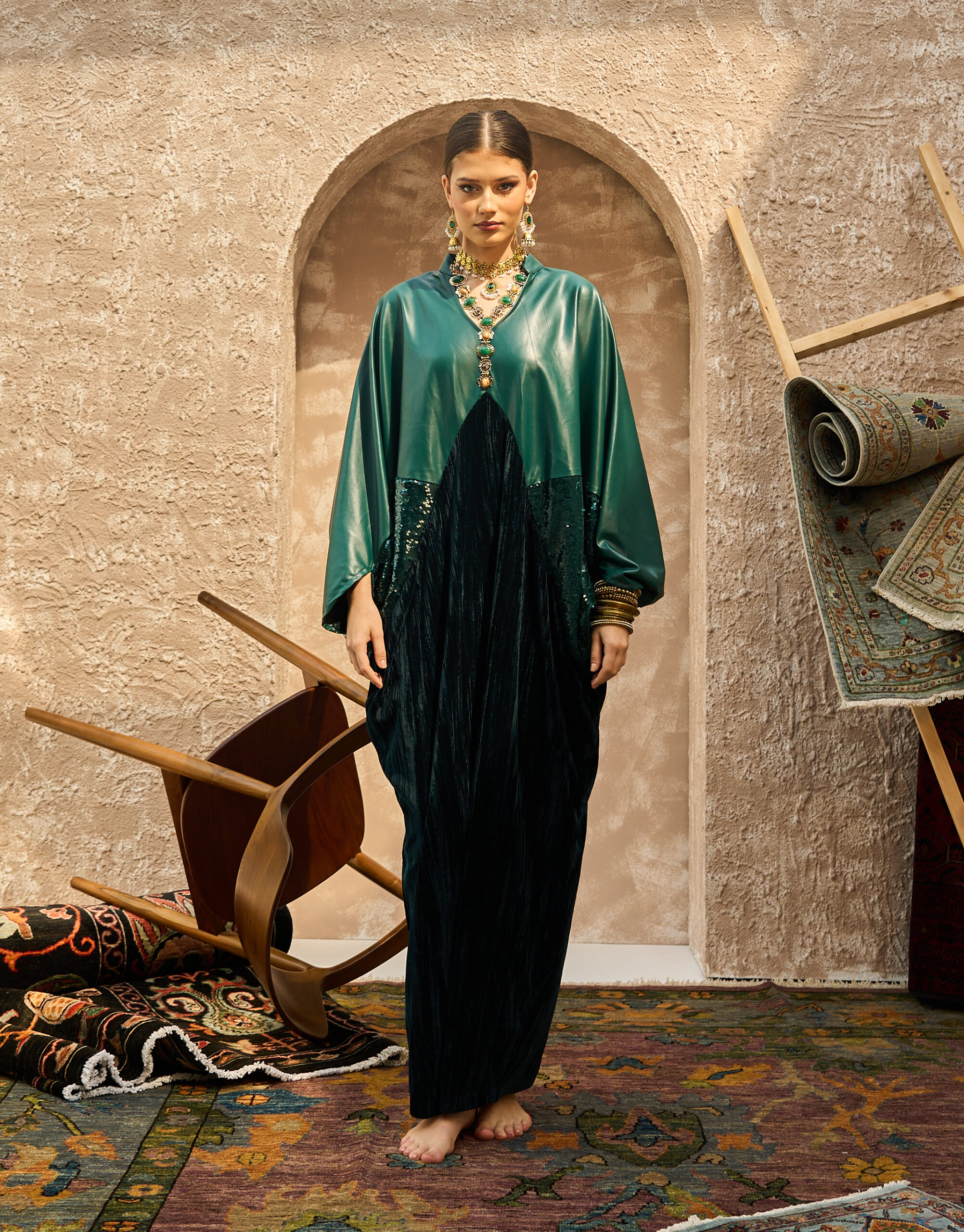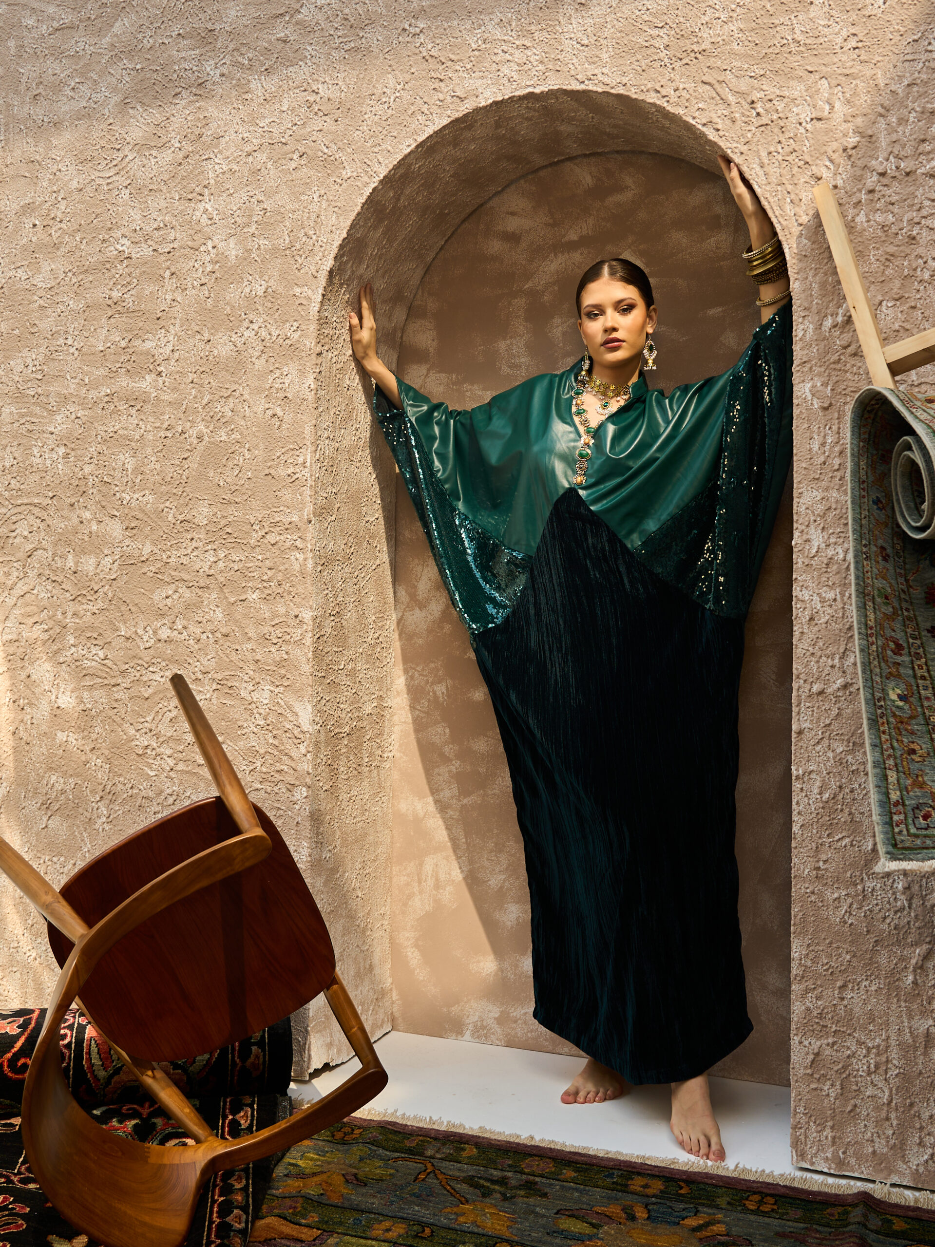 A one-piece kaftan in a rich emerald tone, crafted with a sophisticated blend of three premium textures.