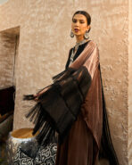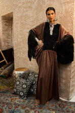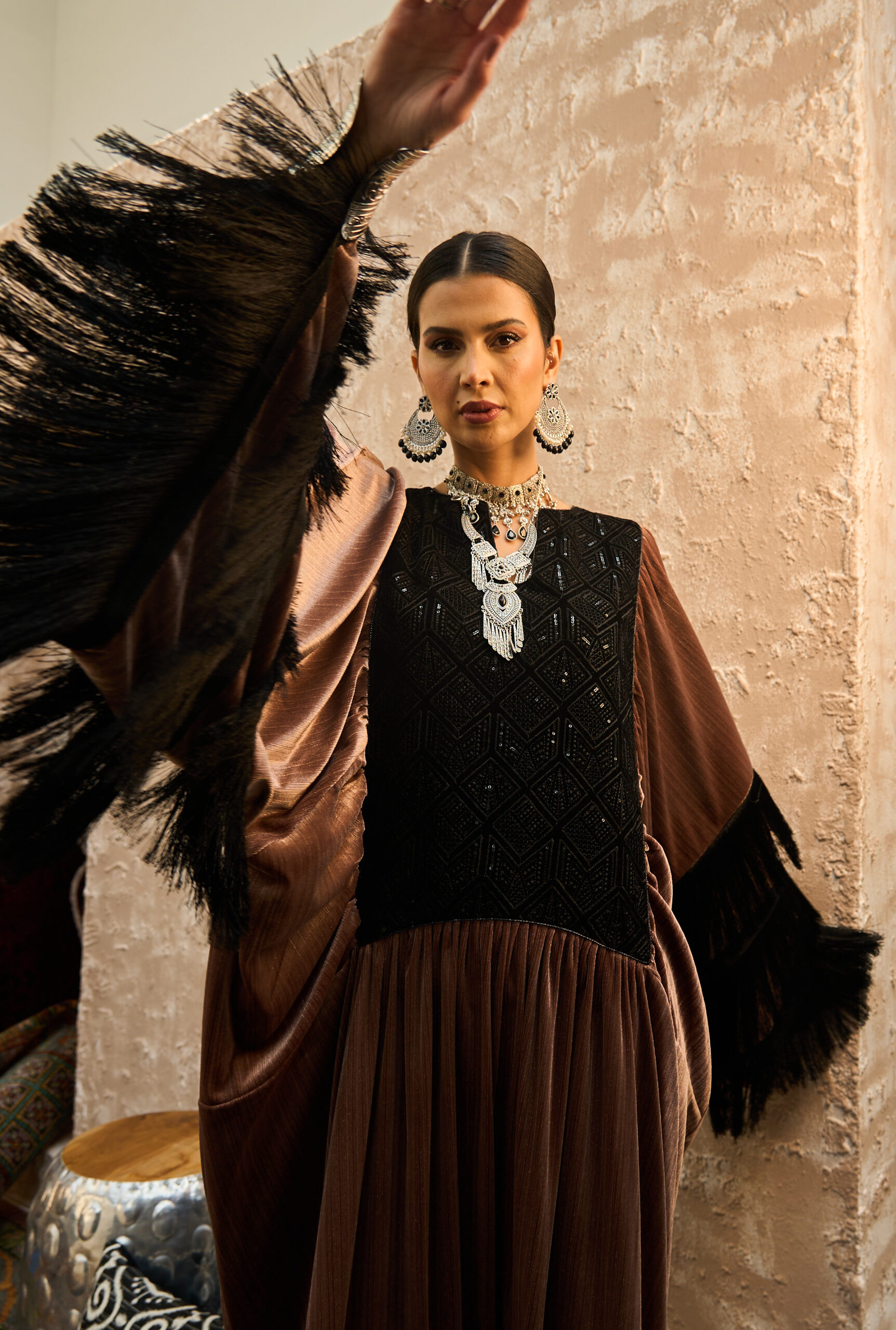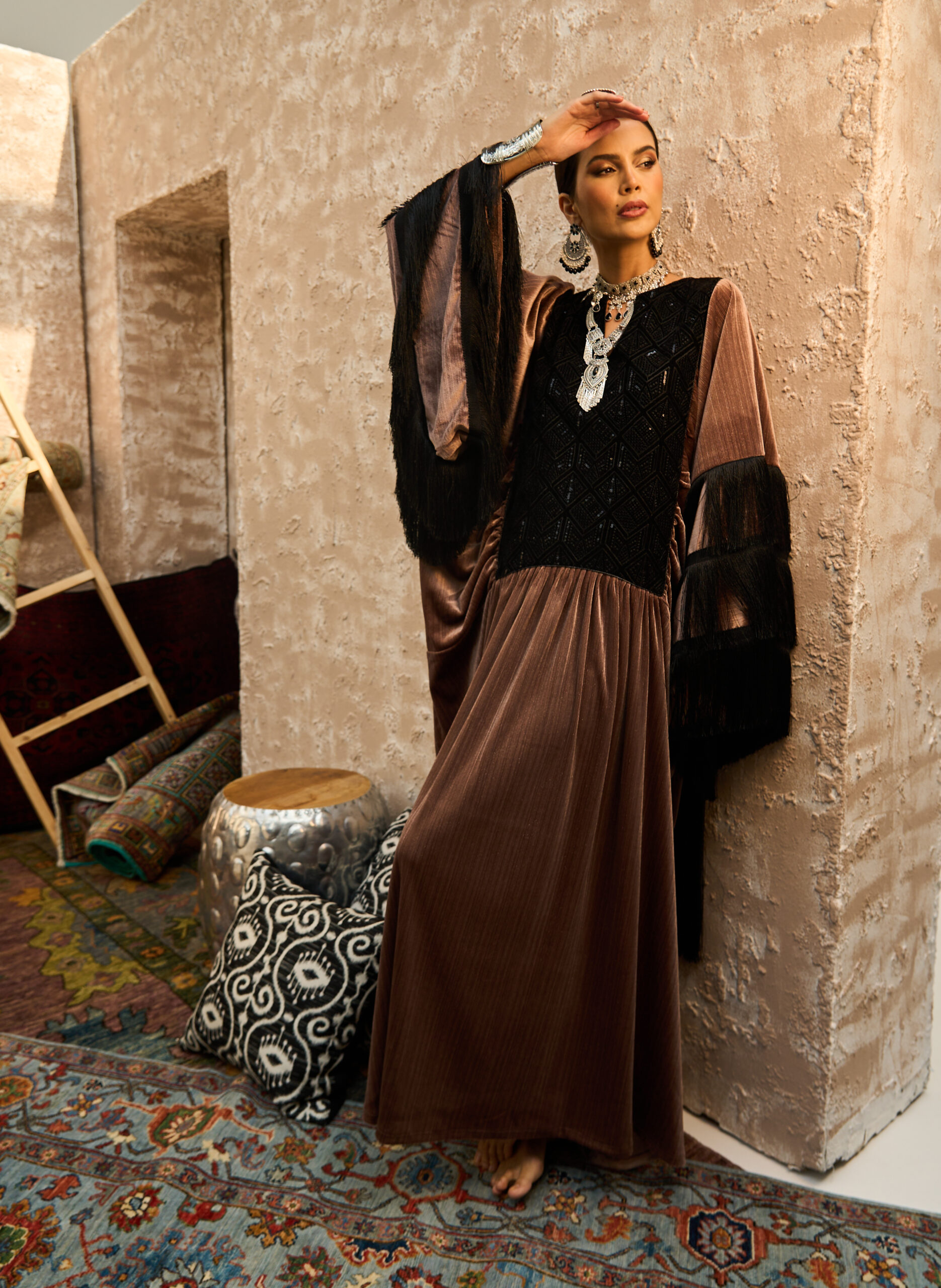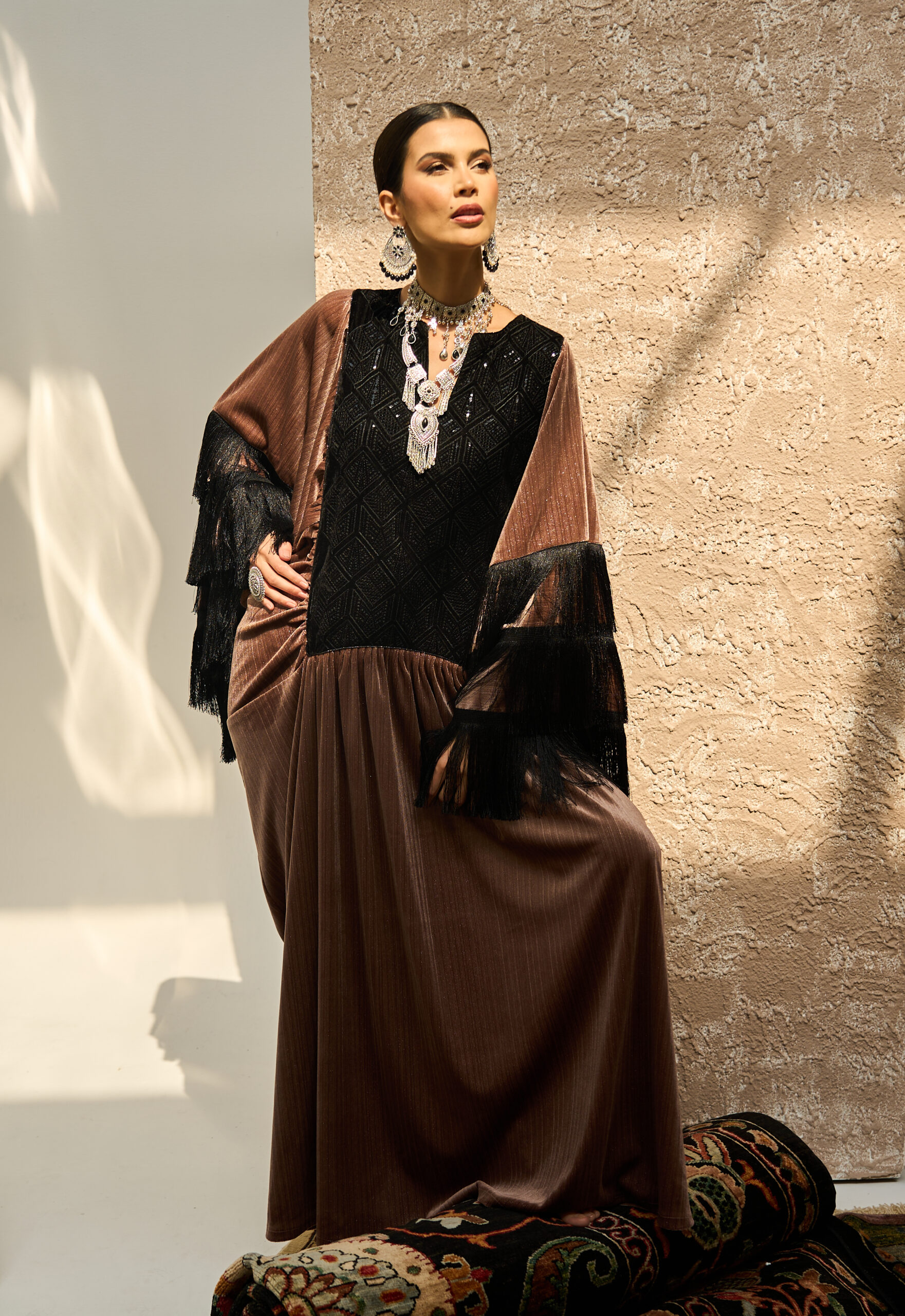 تأتي الأكمام مزدانة بـ هدب أسود من ثلاث طبقات يمنح حركة ونفَس تراثي فاخر، بينما ينفرد التصميم بخلفية لافتة مع هدب أسود طويل نازل من الظهر ليضيف حضوراً دراميًا أنيقاً.
