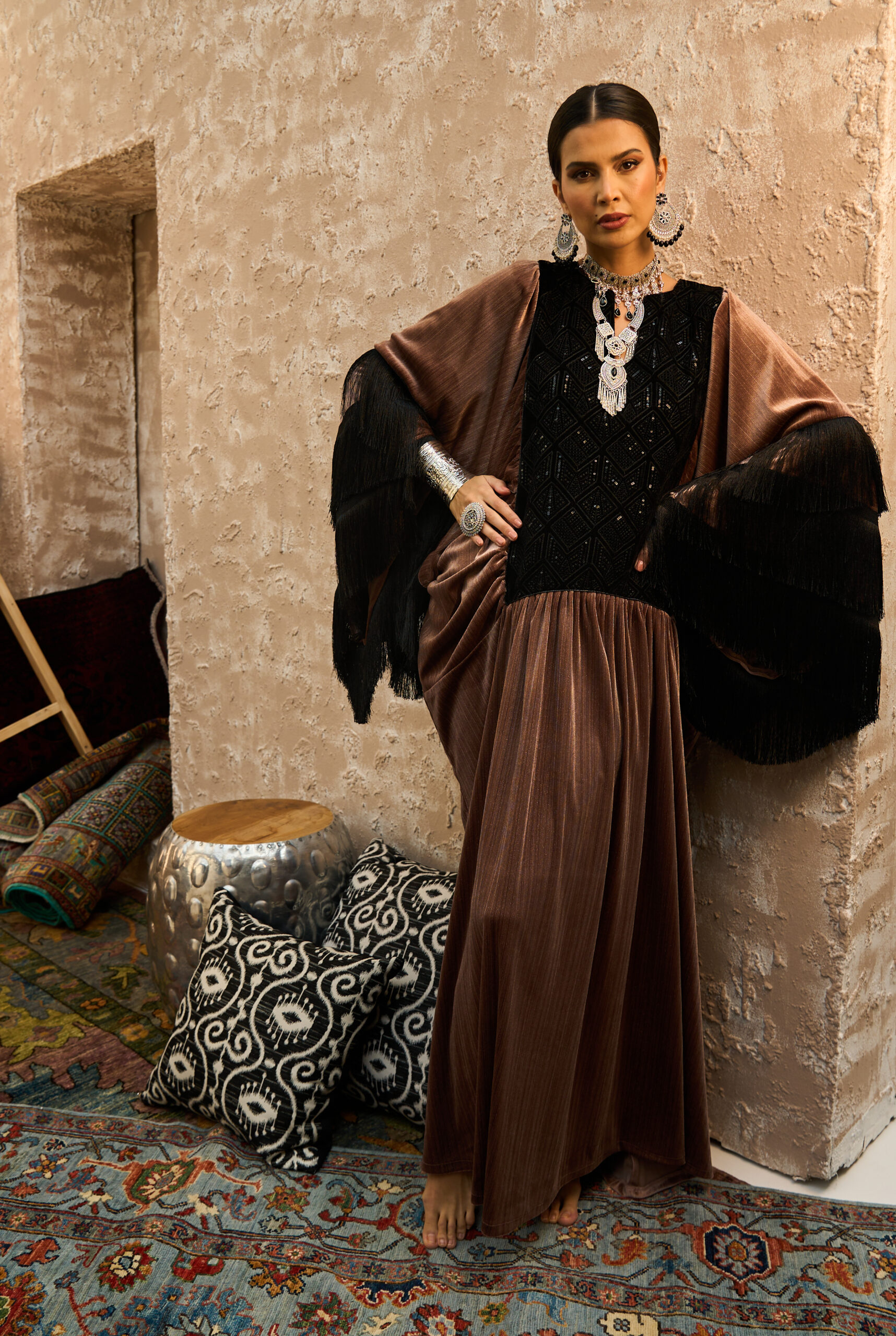 The sleeves are finished with three layers of black fringe, adding movement and a rich heritage feel, while the back is elevated with long cascading black fringe that creates a dramatic, high-fashion silhouette.