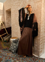 كفتان Rosewood Noir مصنوع من خامة مخملية بلون روزوود وردي ترابي مع خطوط رفيعة ولمعة ناعمة. تتميّز القطعة بقطعة أمامية من مخمل أسود مطرّز مع ترتر أسود منثور بشكل راقٍ.