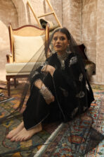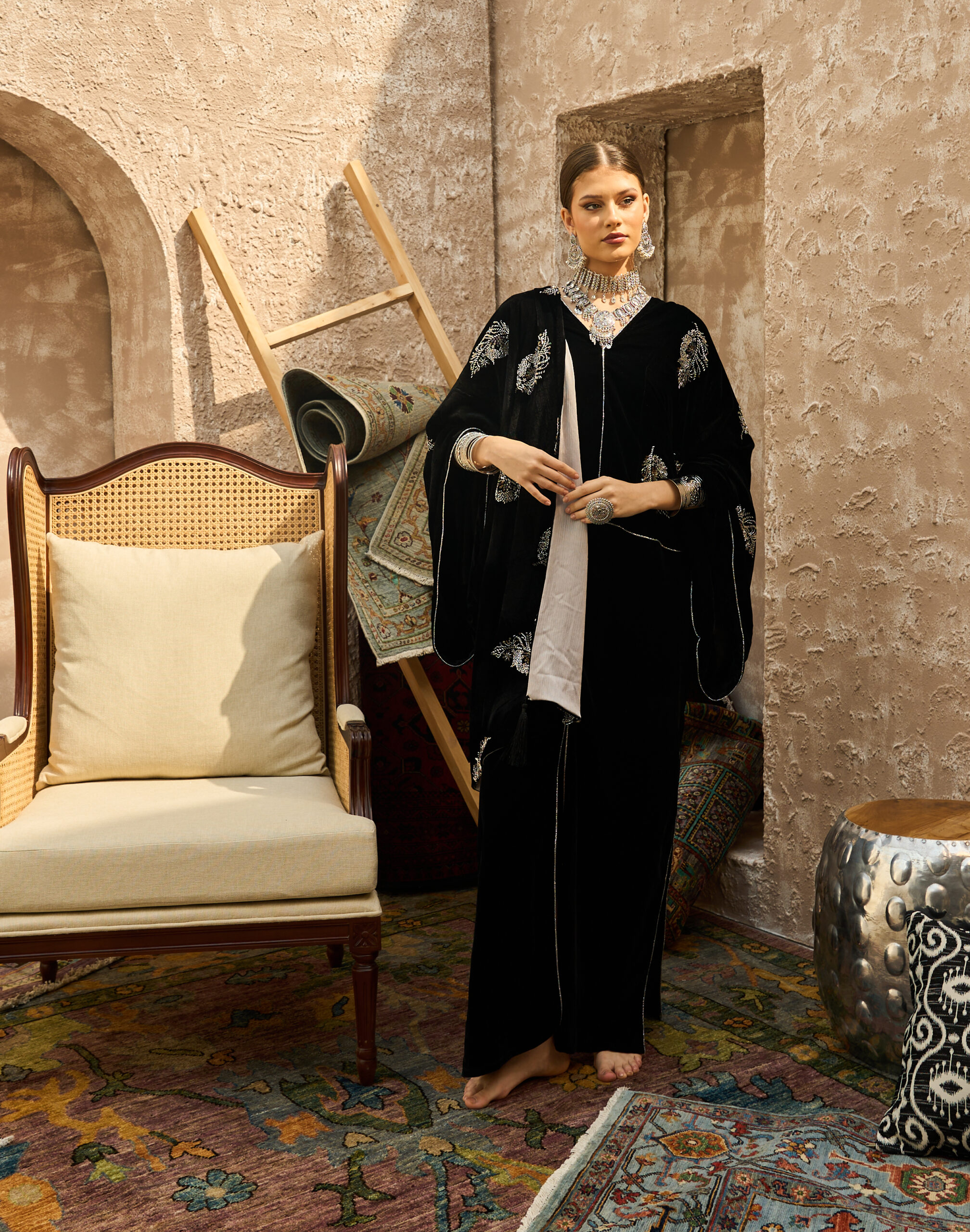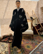 كفتان فاخر من قطعة واحدة مصنوع من مخمل أسود غني، ومزيّن بشك فضّي ناعم مع خرز ملوّن متناغم بدرجات راقية.