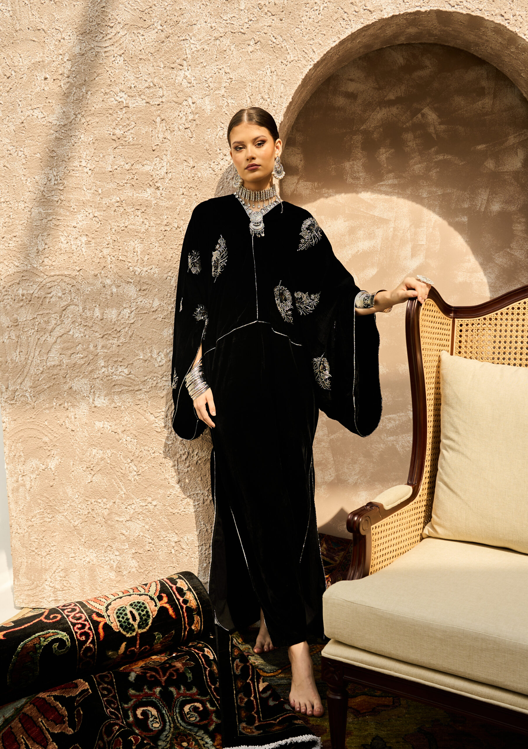 Seren – Black Lux is a statement one-piece kaftan crafted from rich black velvet and adorned with fine silver beadwork combined with soft, multi-colored crystals arranged in harmonious tones.
