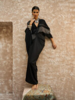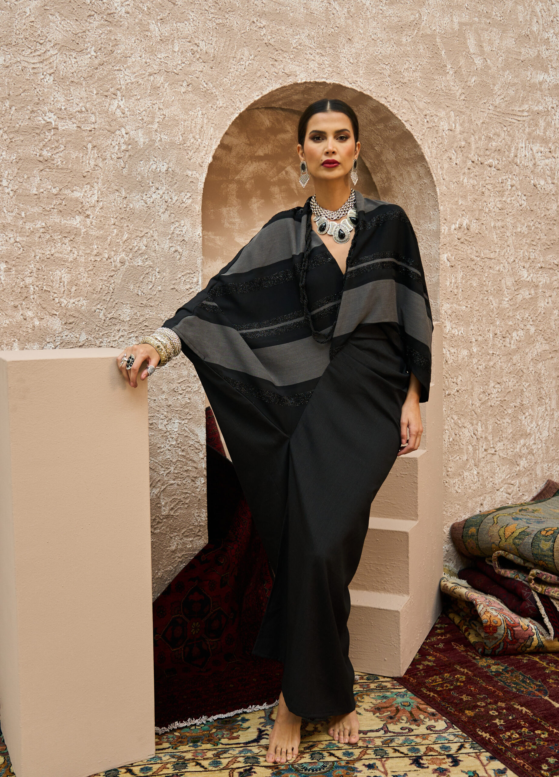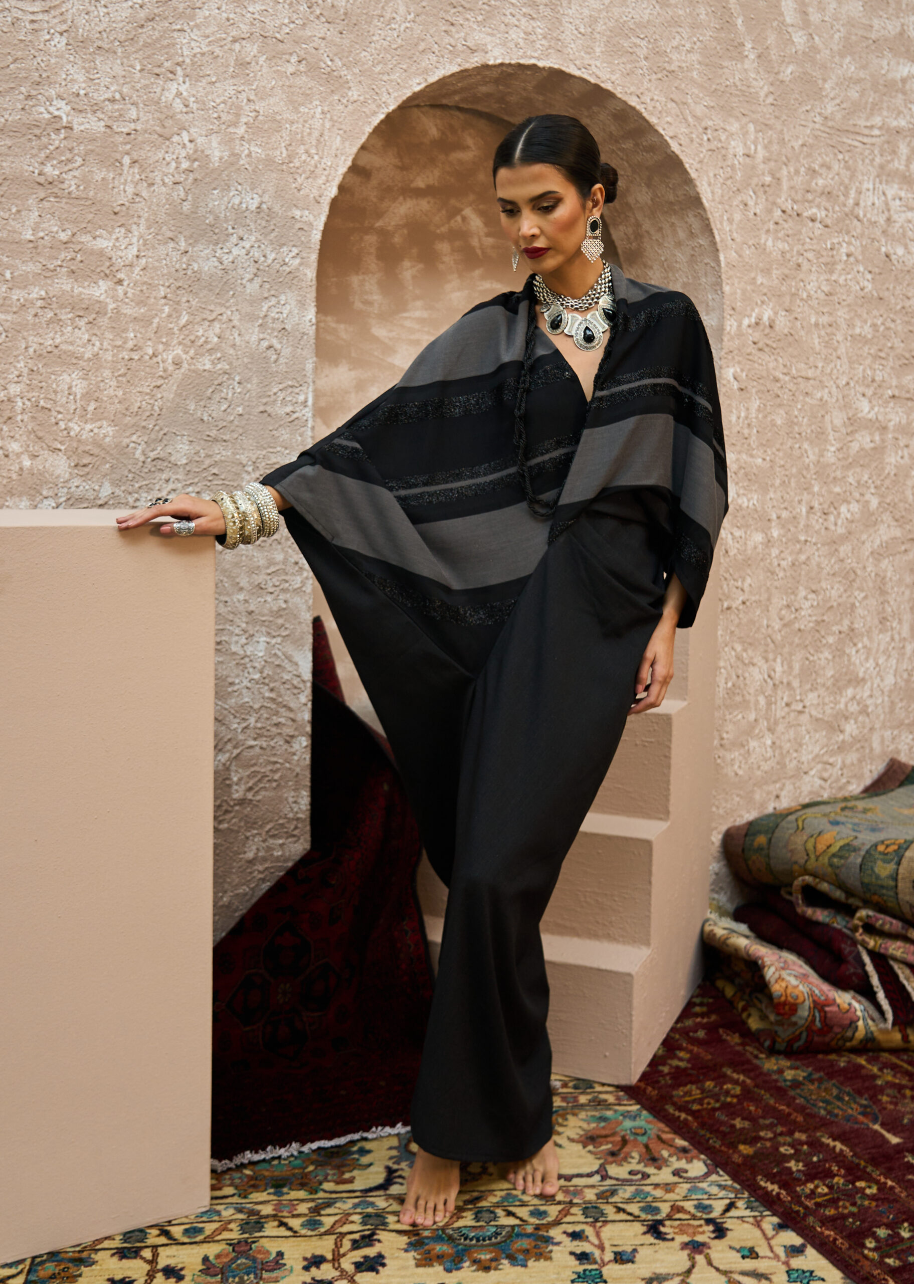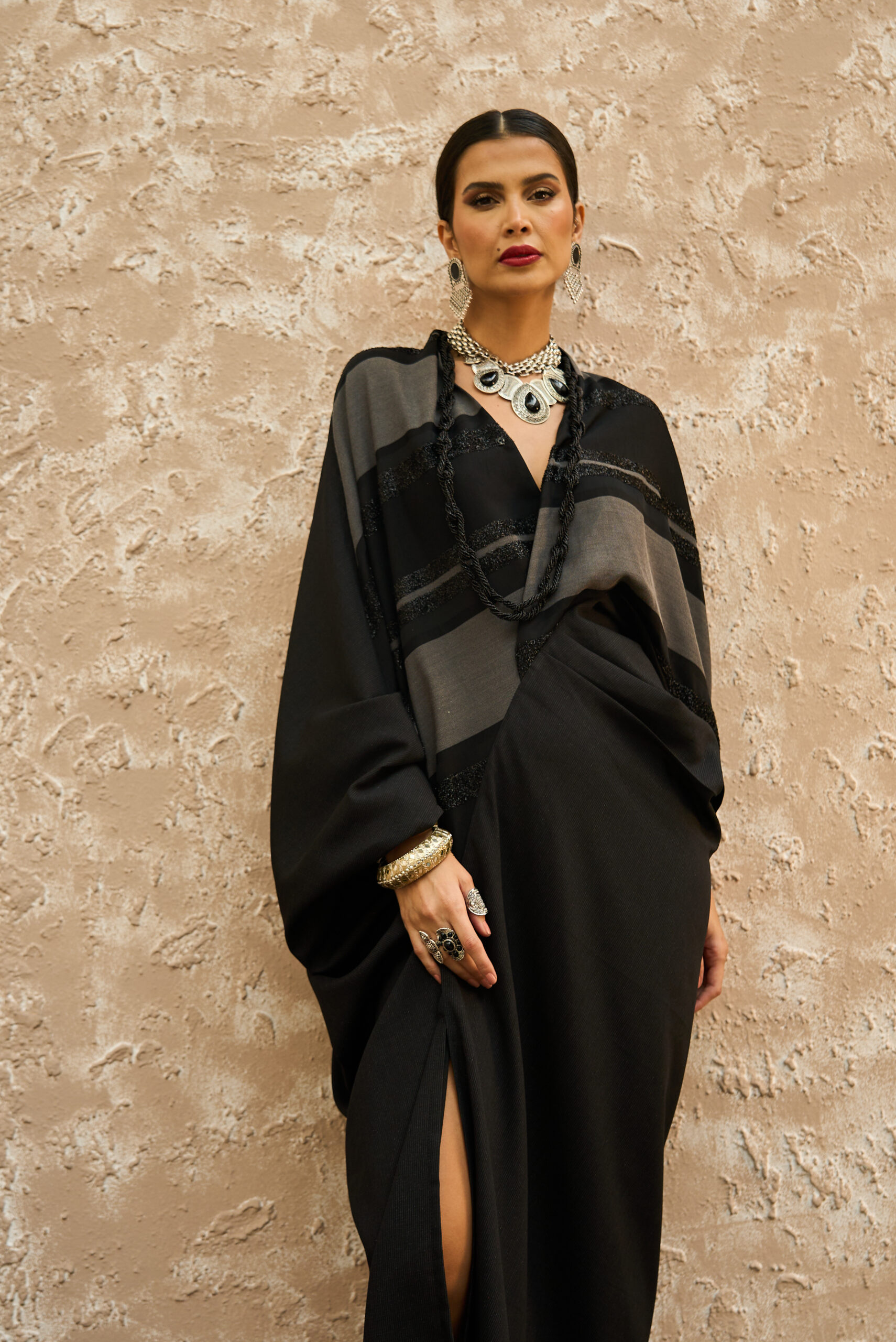 The Shadow Stripes kaftan is a one-piece design featuring bold, wide stripes across the chest and shoulders, giving it a strong and elegant presence.