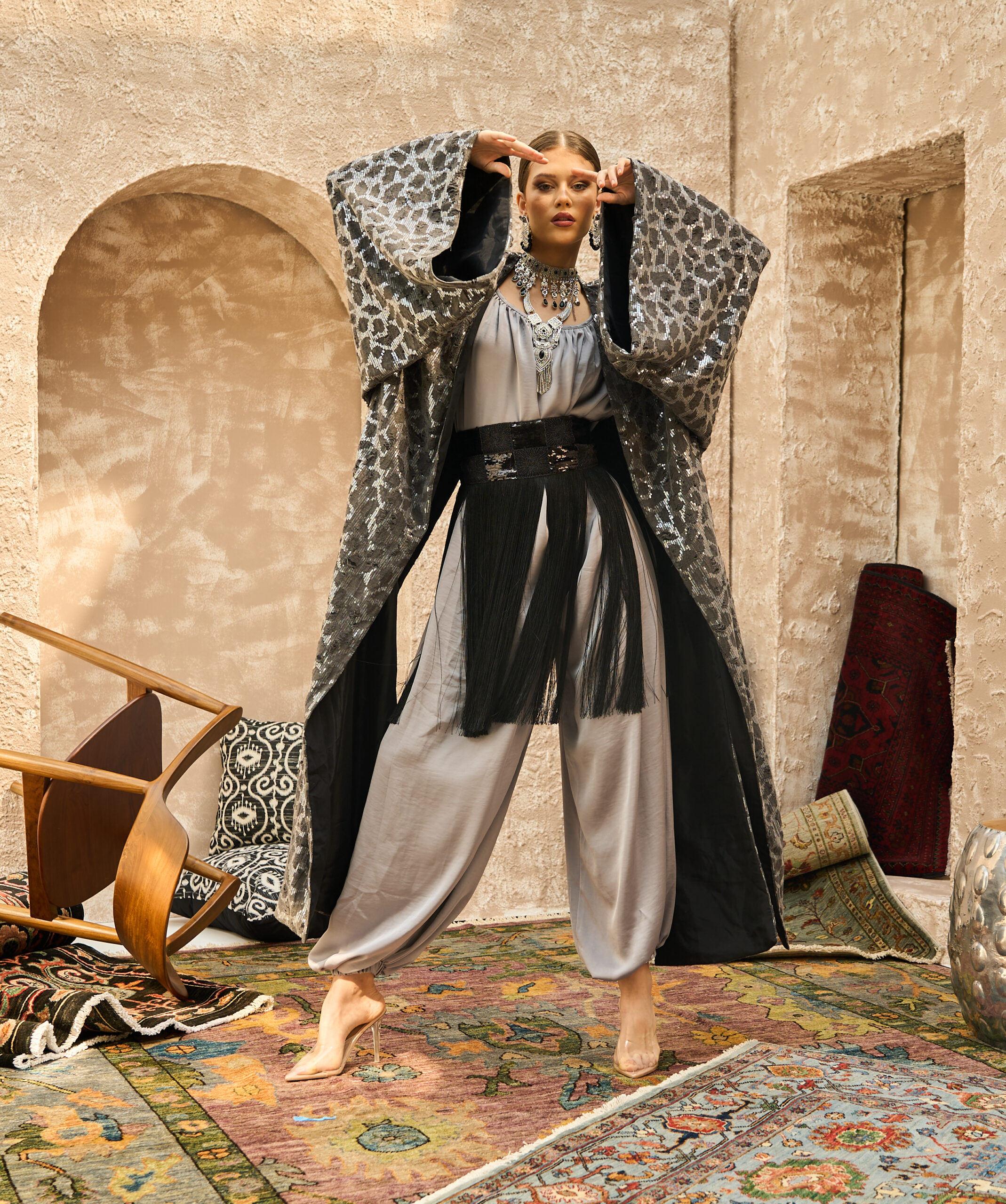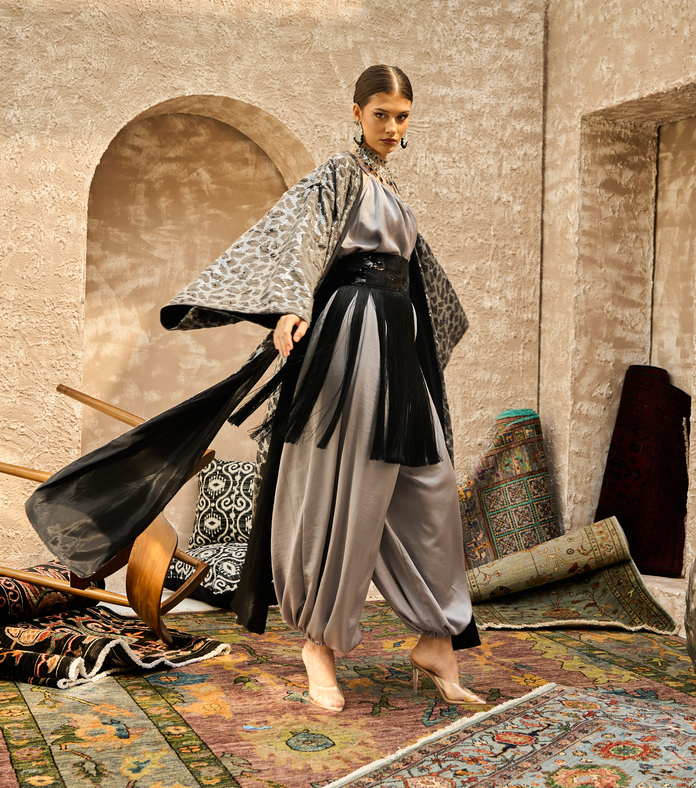 سيلفر إكليبس إطلالة مكونة من قطعتين بتصميم عصري وجريء، تمزج بين خامة الحرير الفضّي وانعكاسات الرمادي اللامع لإطلالة راقية ومميزة.