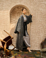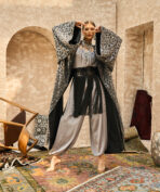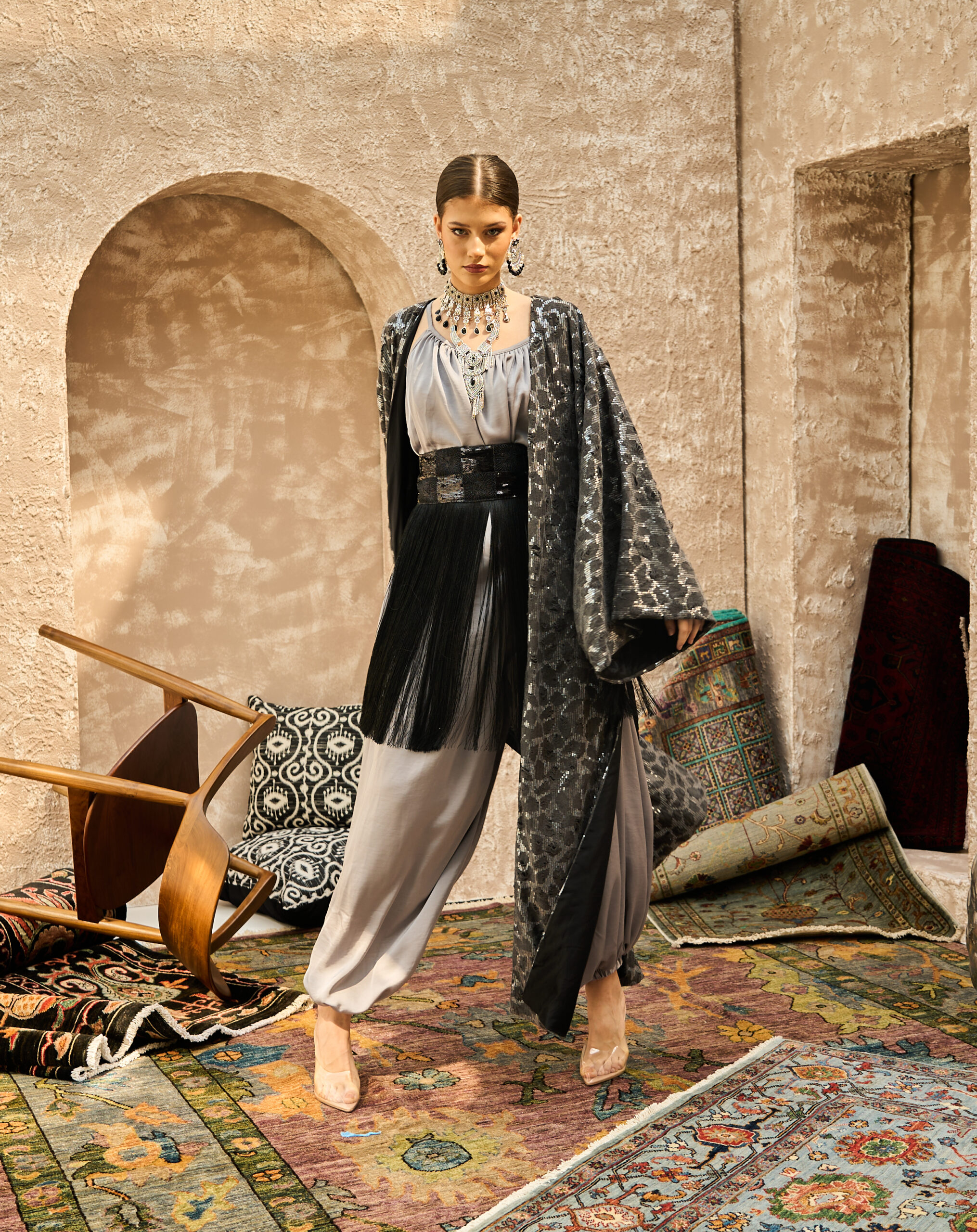 وفوقه يأتي بشت رمادي مطرّز بالترتر مع فتحات جانبية وفتحة خلفية واسعة تضيف عمقاً وحركة أنيقة للتصميم.