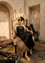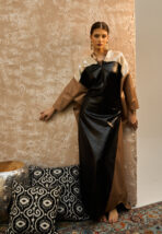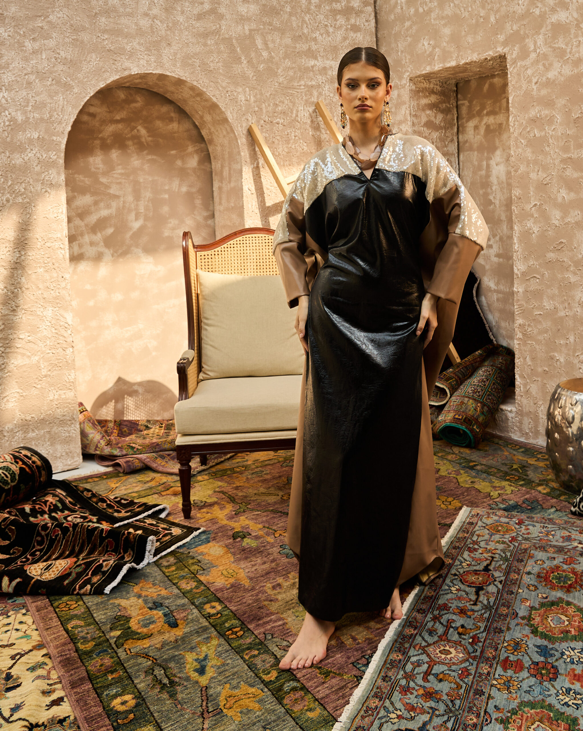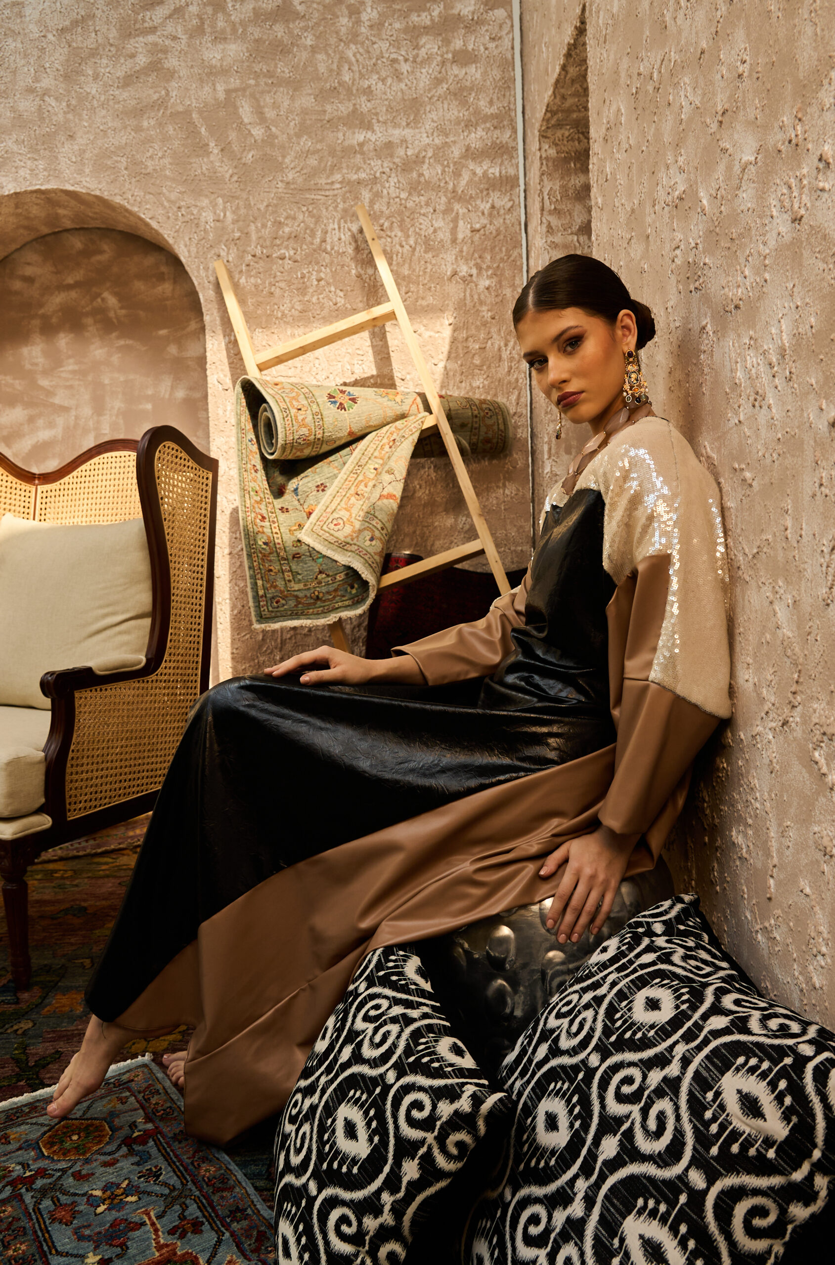 Urban Texture is a modern one-piece kaftan crafted with a refined contrast of soft leather in black and mocha tones, enhanced with off-white sequins for an elegant shimmer.