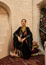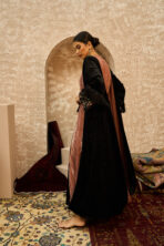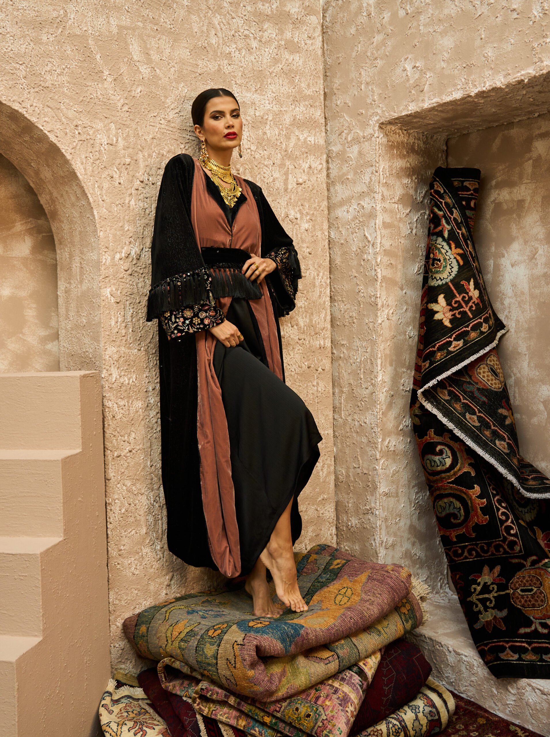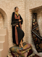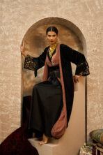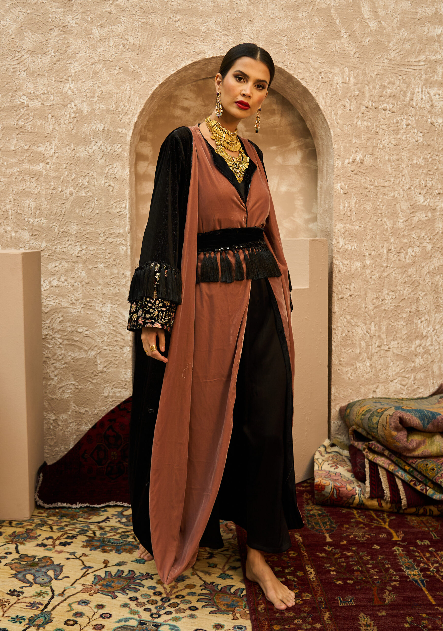 The Velvet Ember kaftan combines rich black velvet with warm apricot tones in a refined, harmonious design. It features a soft inner lining topped with a wrapped velvet bisht that enhances the silhouette with elegant structure. The waist is accented with a sequined belt and flowing fringe, while the sleeves are crafted from velvet with an added embroidered patch and matching fringe for a subtle yet luxurious oriental touch.