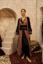 كفتان Velvet Ember – جمرة المخمل يجمع بين المخمل الأسود واللون المشمشي اللحمي في تصميم راقٍ ومتناسق. يتكوّن من بطانة ناعمة وبشت مخملي بقَصّة ملفوفة تضيف فخامة إلى القوام. يتميّز بحزام ترتر مع هدب نازل، بينما تأتي الأكمام من المخمل مع قطعة تطريز مضافة تتكامل مع الهدب لتعطي لمسة شرقية أنيقة.